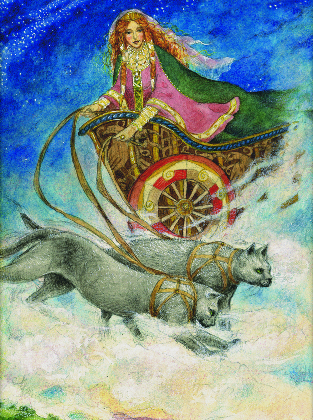 Se dice que esta Diosa gustaba mucho de la presencia de las hadas a las cuales le gustaba ver danzar a la luz de la luna, como Diosa de la belleza le gustaban las joyas y adornos, y solía pasear en su propio carro tirado por gatos, sus animales preferidos, símbolos de la sensualidad y los mimos. Algunos relatos la muestran como vanidosa, ya que se dice que ella hizo el amor con un enano a cambio de un hermoso collar, pero esta versión parece ser muy posterior y se cree que fue inventada por Richard Wagner en su obra, El oro de Andvari, para su ciclo El Anillo de Nibelungo.