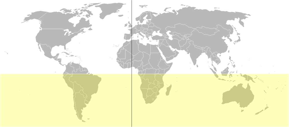 Comprende al continente antártico, en Sudamérica, la parte sur de África, algunas islas de Asia, Australia y la mayoría de las islas de Oceanía.