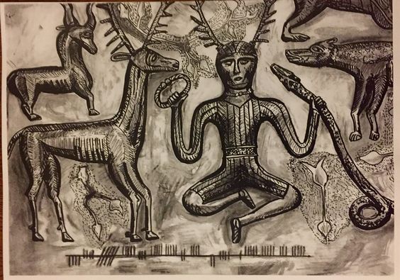 La primera representación conocida de una deidad con cuernos se encuentra en la Caverne des Trois Frères en Ariege, creada durante el período paleolítico. La pintura mural representa a un hombre que lleva una piel de animal con astas de ciervo en su cabeza. Se piensa que la figura representa al dios encarnado que realiza una danza sagrada de la magia simpática para aumentar el número de animales para que la tribu lograra tener una buena cacería.