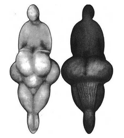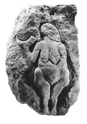 Sobre un refugio rocoso en Laussel, en la Dordoña, a unos pocos kilómetros de distancia de la gran cueva de Lascaux, donde aún cubren sus paredes las más brillantes de estas pinturas-, una estatua femenina de 43 cm de altura contempló alguna vez el valle. Los escultores del Paleolítico la cincelaron en piedra caliza con utensilios de sílex y colocaron en su mano derecha un cuerno de bisonte en forma de luna creciente, con muescas de los trece días de la fase creciente de la luna y de los trece meses del año lunar. Con su mano izquierda apunta hacia su vientre grávido. Su cabeza se inclina hacia la luna creciente, dibujando una curva que conecta la fase creciente de la luna con la fecundidad del útero humano, y que pasa por sus dedos, posados sobre su vientre, para ascender, a través del ángulo que forma su cabeza, hasta el cuerno creciente de su mano. De esta manera se reconocen las pautas de relación que vinculan el orden celeste y el terrestre.