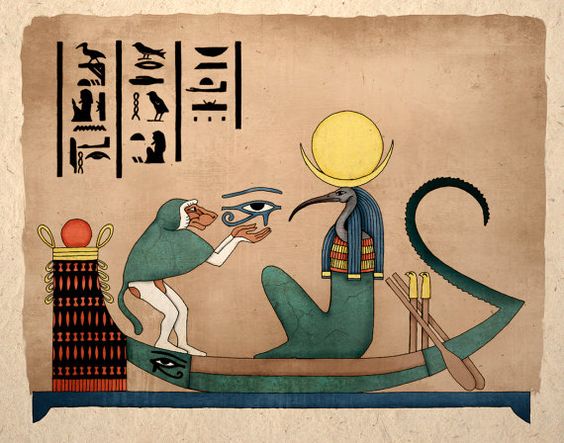 Thoth (nombre griego) o Djehuty/Tehuti (nombre original en egipcio) cuyo nombre significa “El que es como el Ibis” y se le representaba como un ibis o un babuino o el cuerpo de un humano con la cabeza de Ibis, pero nunca con cabeza de babuino.